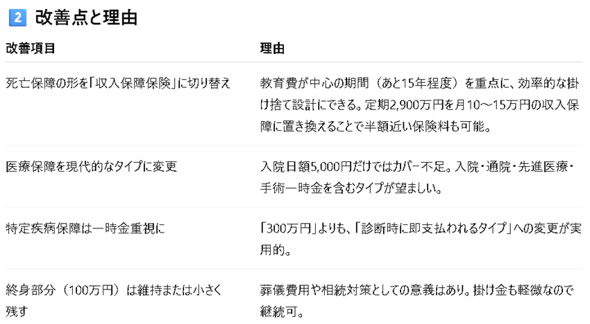 3. 改善後の保険設計の方向性(例:死亡保障を減らして医療保障を強化)