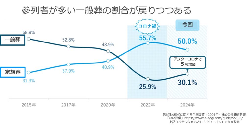 葬儀についても両親の希望を確認するつもりです。下記データもみると、コロナをきっかけに、家族葬を選択する人は増えたようです。家族葬に参列したことがある私も、自分の葬儀も家族葬で充分だな~と思いました。しかし、アフターコロナでは、一般葬が5%増加したことは興味深いと感じます。