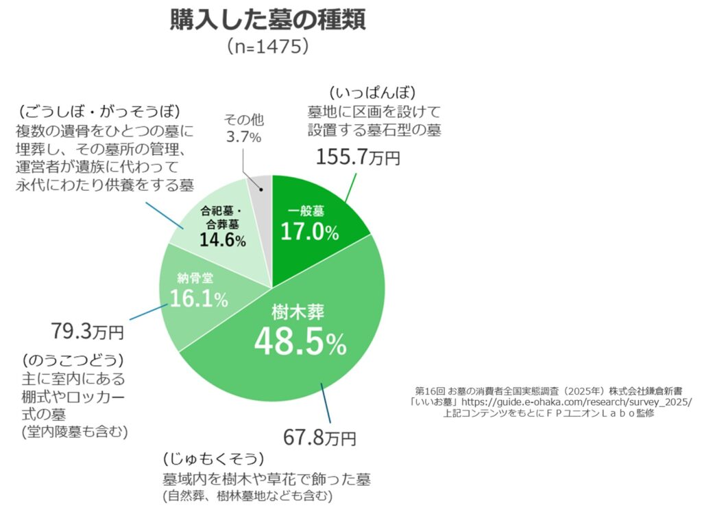 上記データを見ても、永代供養墓の平均購入額が割安であることが分かります。樹木葬(67.8万円)は、一般墓(155.7万円)に比べて、コストが半額以下になっていることも人気を集めている理由だと思います。