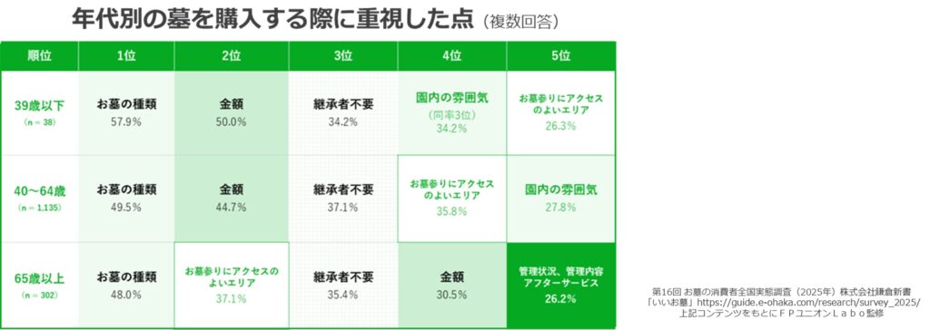 また、興味深いことは、上記データ「年代別の墓を購入する際に重視した点」において、【継承者不要】という理由が各世代共通で3位に上がっていることです。時代は少しずつ変わり、将来的には「先祖代々のお墓に入ること」は珍しく、少数派になってくるのかもしれませんね。