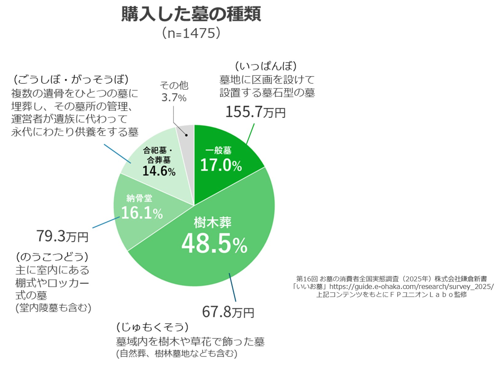 上記データを見ても、永代供養墓の平均購入額が割安であることが分かります。樹木葬(67.8万円)は、一般墓(155.7万円)に比べて、コストが半額以下になっていることも人気を集めている理由だと思います。