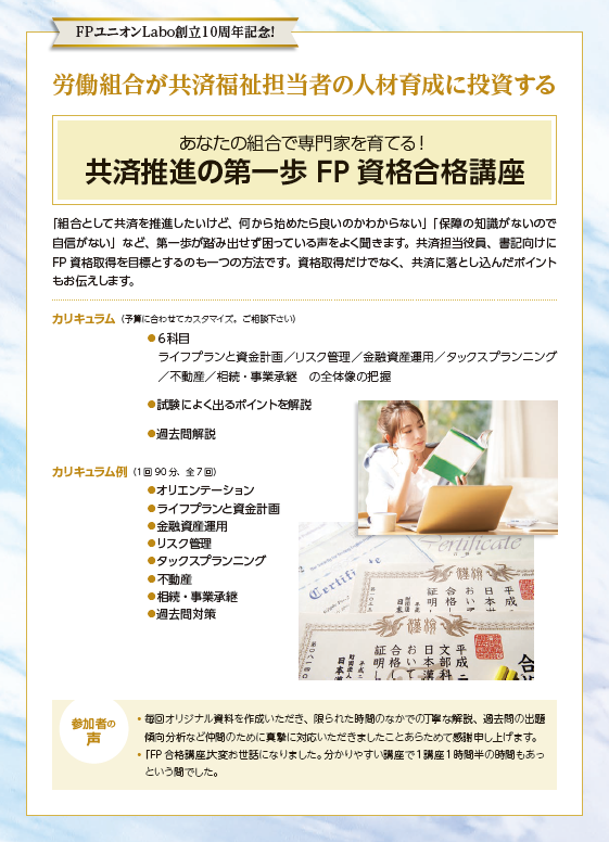 FP資格の勉強は、身近なお金の知識習得にもなりますが、「組合として共済を推進したいけど、何から始めたら良いのかわからない」「保障の知識がないので自信がない」など、第一歩が踏み出せず困っている声をよく聞きます。共済担当役員、書記向けにFP 資格取得を目標とするのも一つの方法です。資格取得だけでなく、共済に落とし込んだポイントもお伝えします。