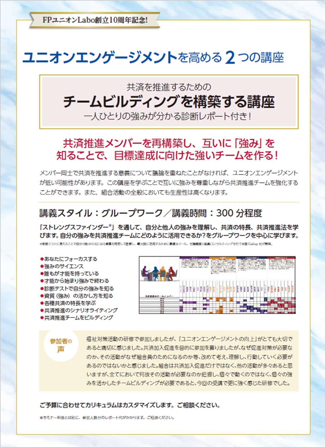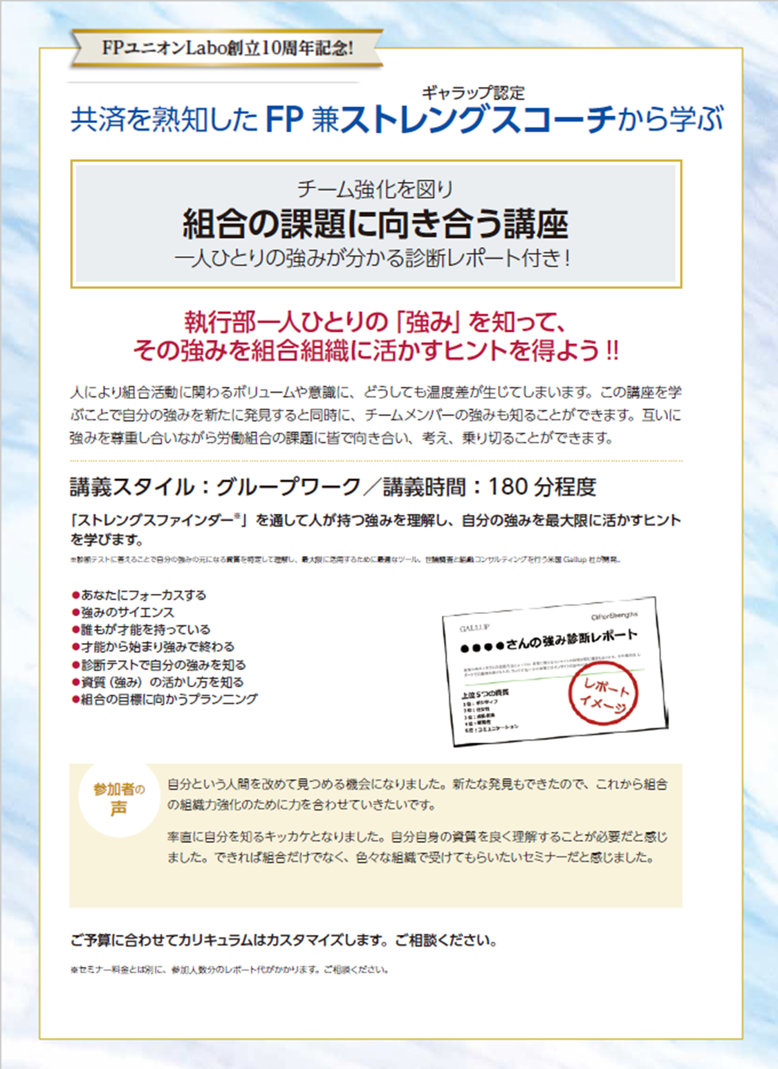 共済推進や、労働組合という組織を知るFPユニオンLaboならではの、一人一人の「強み」を知って組織強化に繋げるセミナーです。ギャラップ認定のコーチが、一人一人のレポートをもとにお伝えします。内容は、組合事情や、組織の課題・目的に合わせてカスタマイズ可能です。