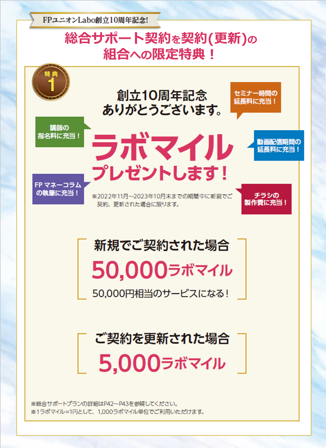 おかげさまで、FPユニオンLaboは創立10周年を迎える事となりました。これもひとえに、皆さま方のご支援の賜物と深く感謝申し上げます。