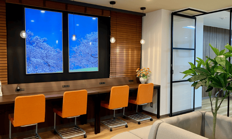 好きな席を選んで仕事ができる - 執務スペースの他に、季節感のある映像に癒される