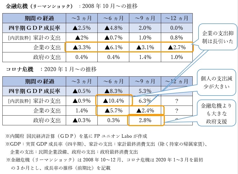 経済指標として代表的なGDP(国内総生産)で、その内訳の家計・企業・政府の支出(投資)の動きを整理したのが次の表です。経済が大きく落ち込んだ時期を起点にしていますが、四半期ごとの統計ですので、ざっくりとした比較になっています。(金融危機:2008年10-12月、コロナ危機:2020年1-3月を起点)。