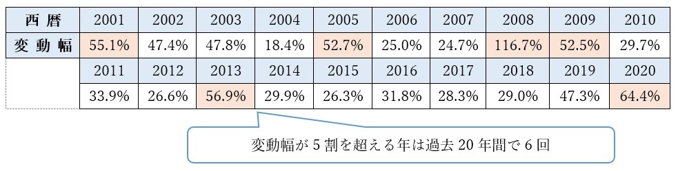 変動幅が約6割(高値が安値の約1.6倍)と非常に大きい印象があります。