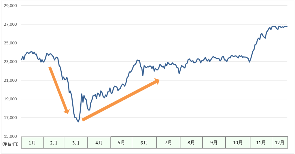 新型コロナウイルス感染症拡大の報道とあわせて、日経平均株価は2月に23,000円台だった水準から3月には安値の16,300円台までスルスル下がりましたが、その後12月までに26,800円台(※)へ上昇(※執筆時点で確認できる12月18日までの実績)。大きな下落と上昇を経験した今年は