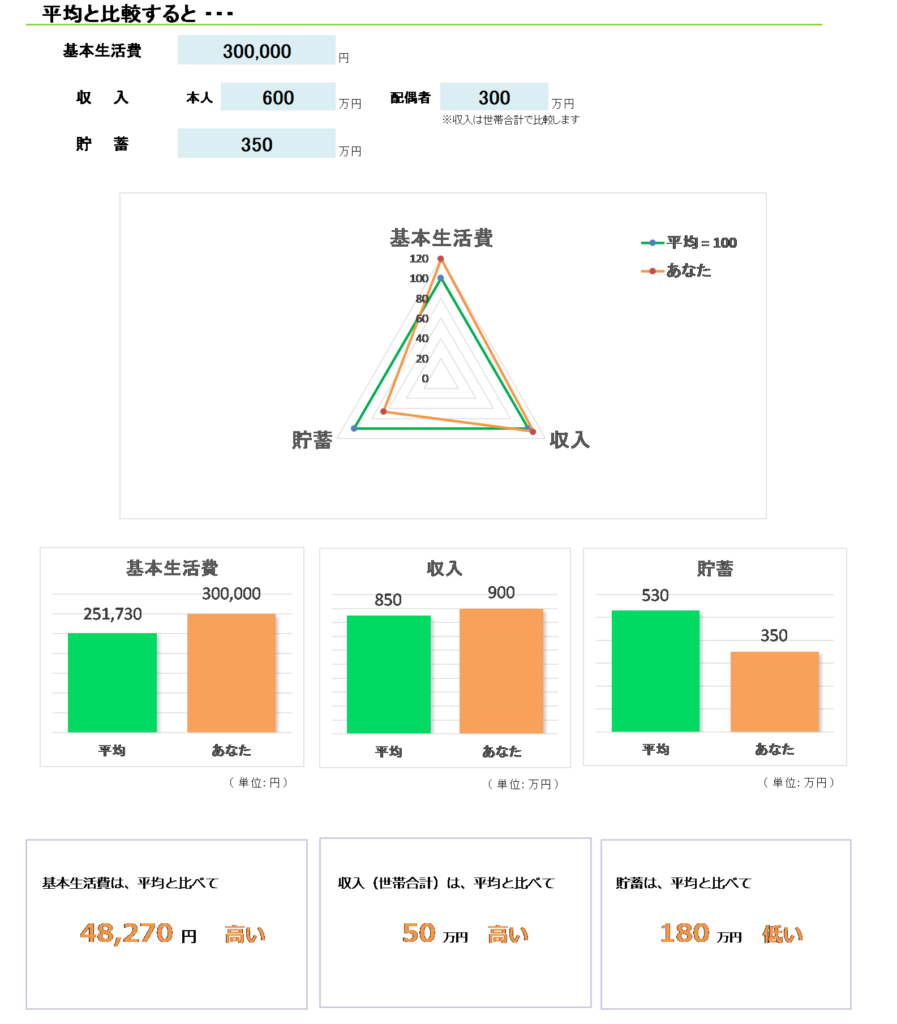 先ほどの「基本生活費」「収入」「貯蓄」のバランスを見てみると