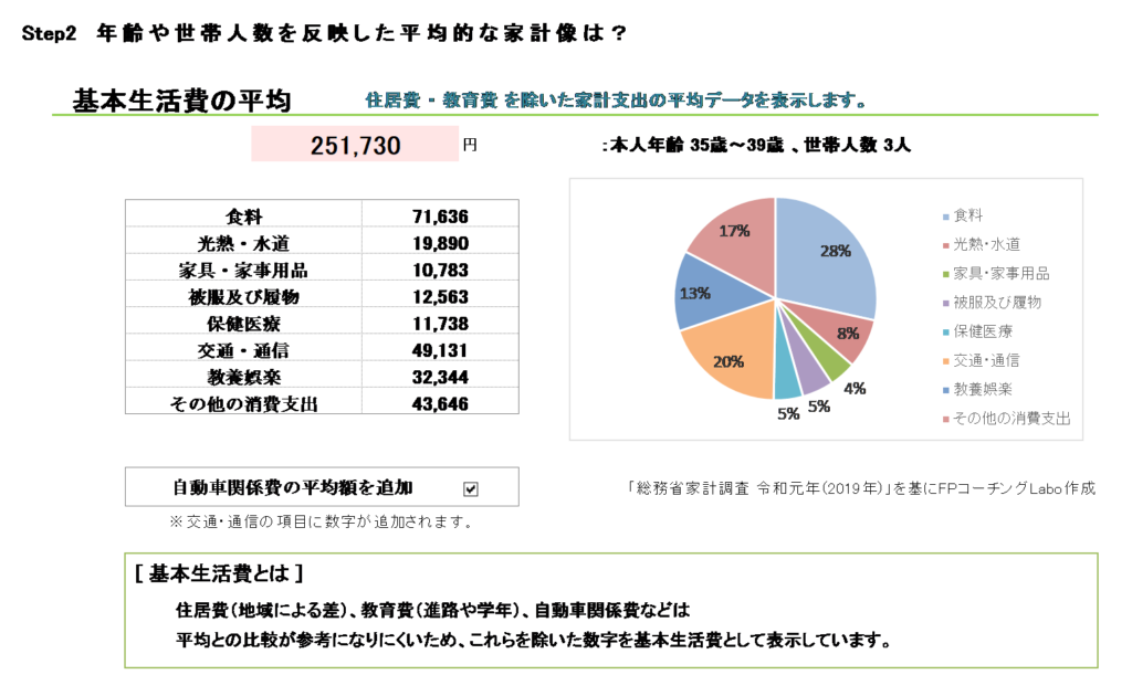 FP:まずは基本生活費になりますが、こちらは、住居費や教育費を除いた金額になります。お車の費用なども入っております。