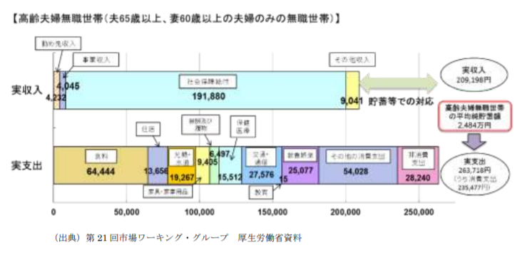 「夫 65 歳以上、妻 60 歳以上の夫婦のみの無職の世帯では毎月の不足額の平均は約5万円であり、まだ 20~30 年の人生があるとすれば、不足額の総額は単純計算で 1,300 万円~2,000 万円になる。」(一部抜粋)