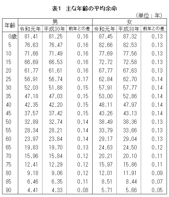 また、平均寿命以外にも、「ある年齢の人が、あと何年生きることができるのか」を表している平均余命も公表されています。以下表1