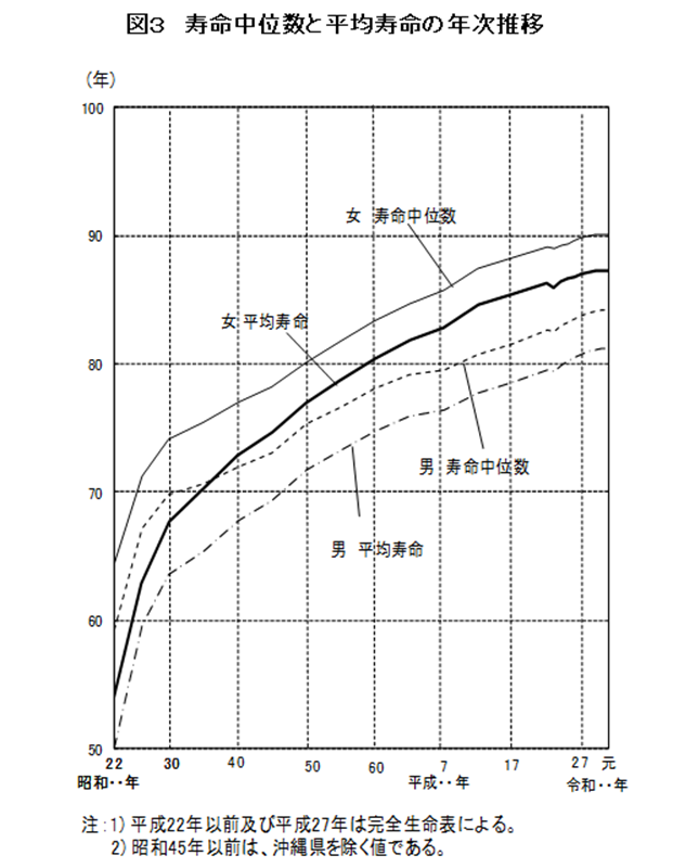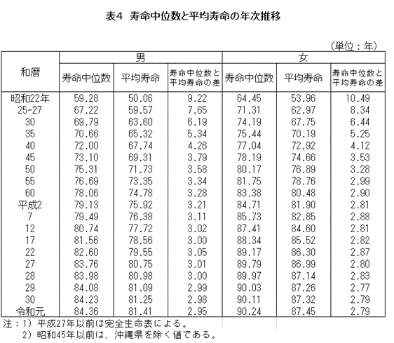 年齢ごとではなく、全体の出生者のうち半数が生存すると期待される年数の寿命中位数は、最新の情報で男84.36年、女90.24年となり、男で2.95年、女で2.79年、平均寿命より上回っているのです。