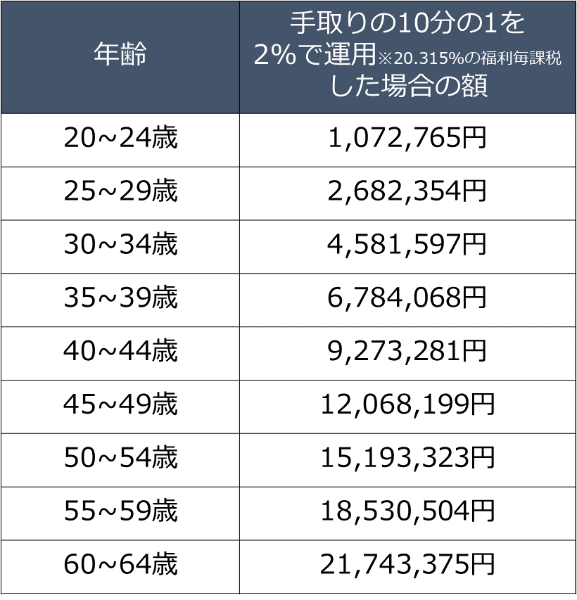 上記の手取りの方が、20歳から64歳まで手取り10分の1を、2%の利回りで働かせていくとどうなるのか。