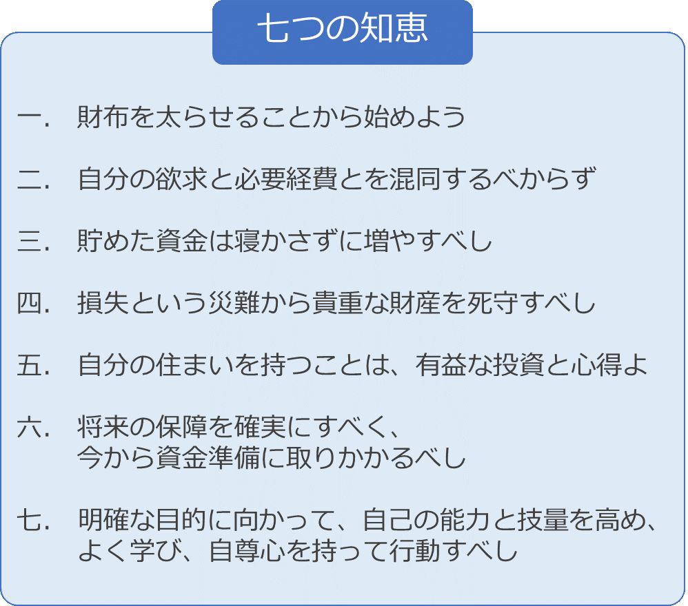 第五の知恵は、「自分の家を手に入れよう」というもので、ローンの返済が終われば、生活コストも下がり、自分の欲求を満足させるために使えるお金も増え、精神的にも安心できるというようなことが書かれています。