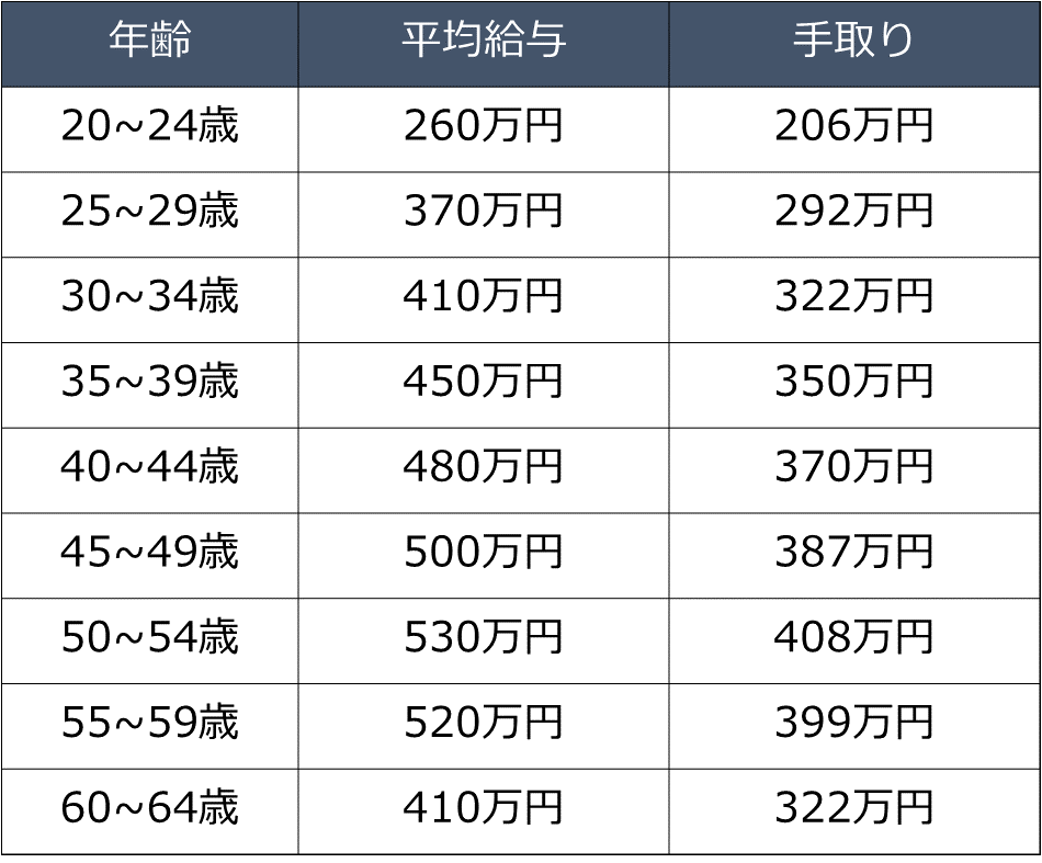まず、国税庁「令和元年度 民間給与実態統計調査」を基に、年代階層別の平均給与(男女計)から税金や社会保険を引いた手取りをまとめたものがこちらです。