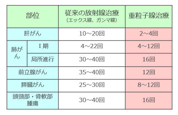 あくまでも目安ですが、以下に肝がんに対して照射するエックス線と重粒子線をご覧ください。エックス線・ガンマ線においては10回~20回の照射のところ、重粒子線は2回~4回と少なく、治療期間も短くすることが可能とされています。