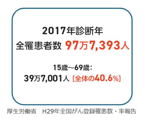 2017年にがんに罹患したと診断された人は約98万人で、69歳までに診断された方はがん罹患者全体の約40%に相当します。