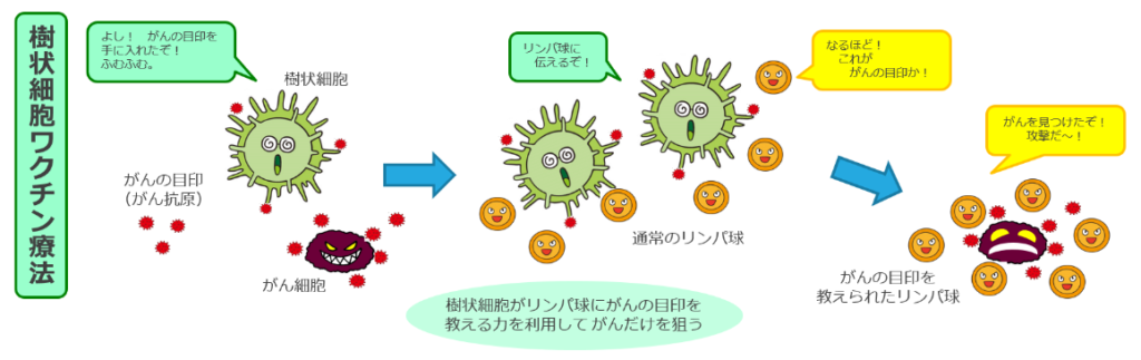 自分の樹状細胞(免疫細胞に司令塔)に、がんの目印(がん細胞が放出するもの)を覚えさせます。培養された樹状細胞を体内に戻し、リンパ球にがんの目印を見つけたら攻撃するよう指示します。