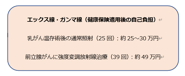 エックス線・ガンマ線は、健康保険が適用されますが、重粒子線は先進医療として健康保険の適用にならず、治療のための技術料として約300万円前後が全額自己負担となることが一般的です。