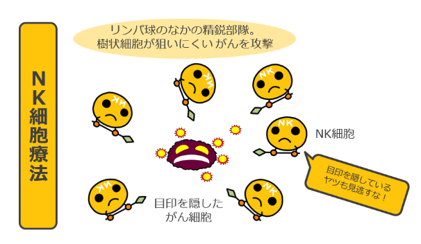 次に、NK細胞療法はナチュラルキラー細胞を活用した治療です。この細胞は他からの指示を必要とせず、一人で外敵や異物を攻撃しますので、生まれつきの殺し屋(naturalkiller)という名前です。