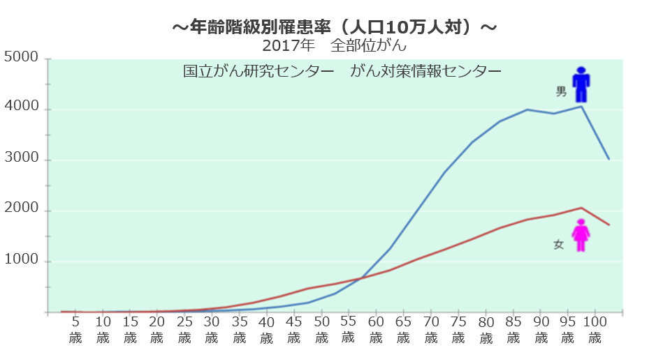 やはり、年齢を重ねるほど、がんの罹患率が高まることがデータから見ても分かります。また、30歳~60歳あたりでは女性の罹患率が男性より高いことが分かります。