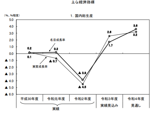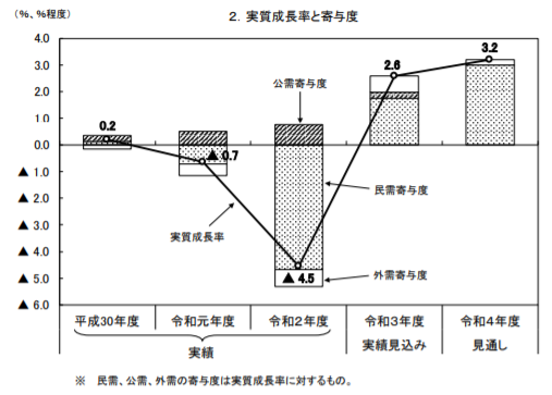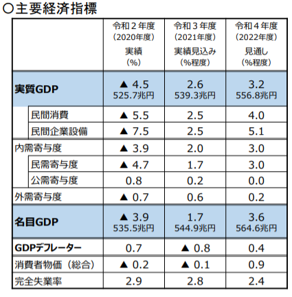 「我が国経済は、長引く新型コロナウイルス感染症の影響の下にあるが、令和3年9月末をもって、全国の緊急事態宣言及びまん延防止等重点措置は全て解除され、行動制限も段階的に緩和されてきたこと等から、厳しい状況は徐々に緩和されており、このところ持ち直しの動きがみられる。(中略)こうした下で、令和3年度の実質国内総生産(実質GDP)成長率は2.6%程度、名目国内総生産(名目GDP)成長率は 1.7%程度となり、GDPは令和3年度中に感染拡大前の水準を回復することが見込まれる。(以下省略)」