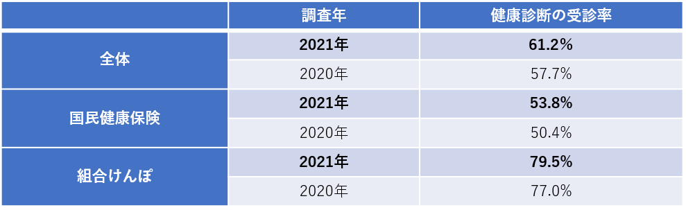 企業にお勤めの方が多く加入されている「組合けんぽ」のみで受診率をみると2021年は79.5%と全体より高くなりますが、5人に1人の方は受けていないということになります。
