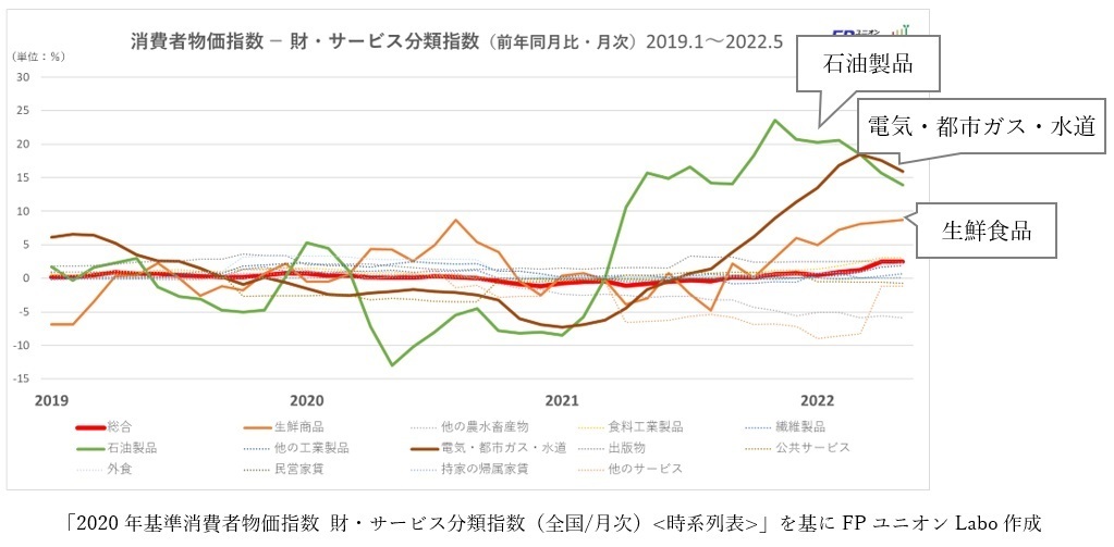 インフレが集中しているのは「石油製品」「電気・都市のガス・水道」「生鮮食品」といった項目で「石油製品」「電気・都市ガス・水道」は直近でも15%近く上昇。